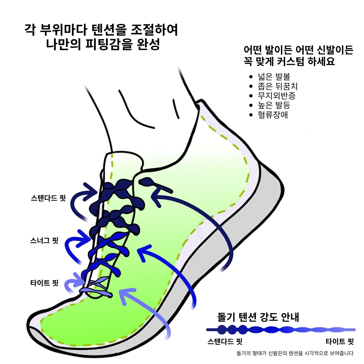 불필요한 부품 없이 간편하게 텐션 조절이 가능한 신발끈