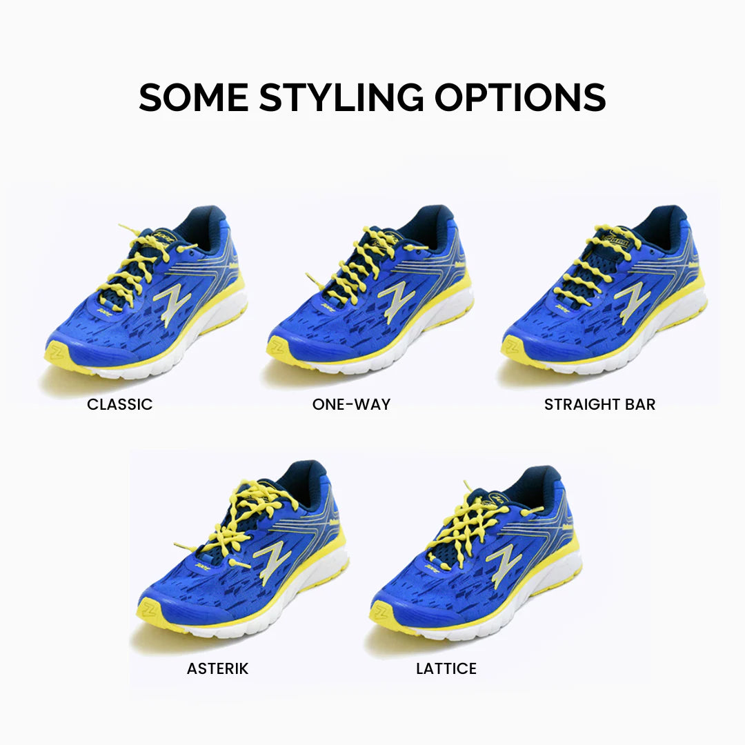 Non-tying active laces with patented elastic technology that provides adjustable tension between shoe eyelets.